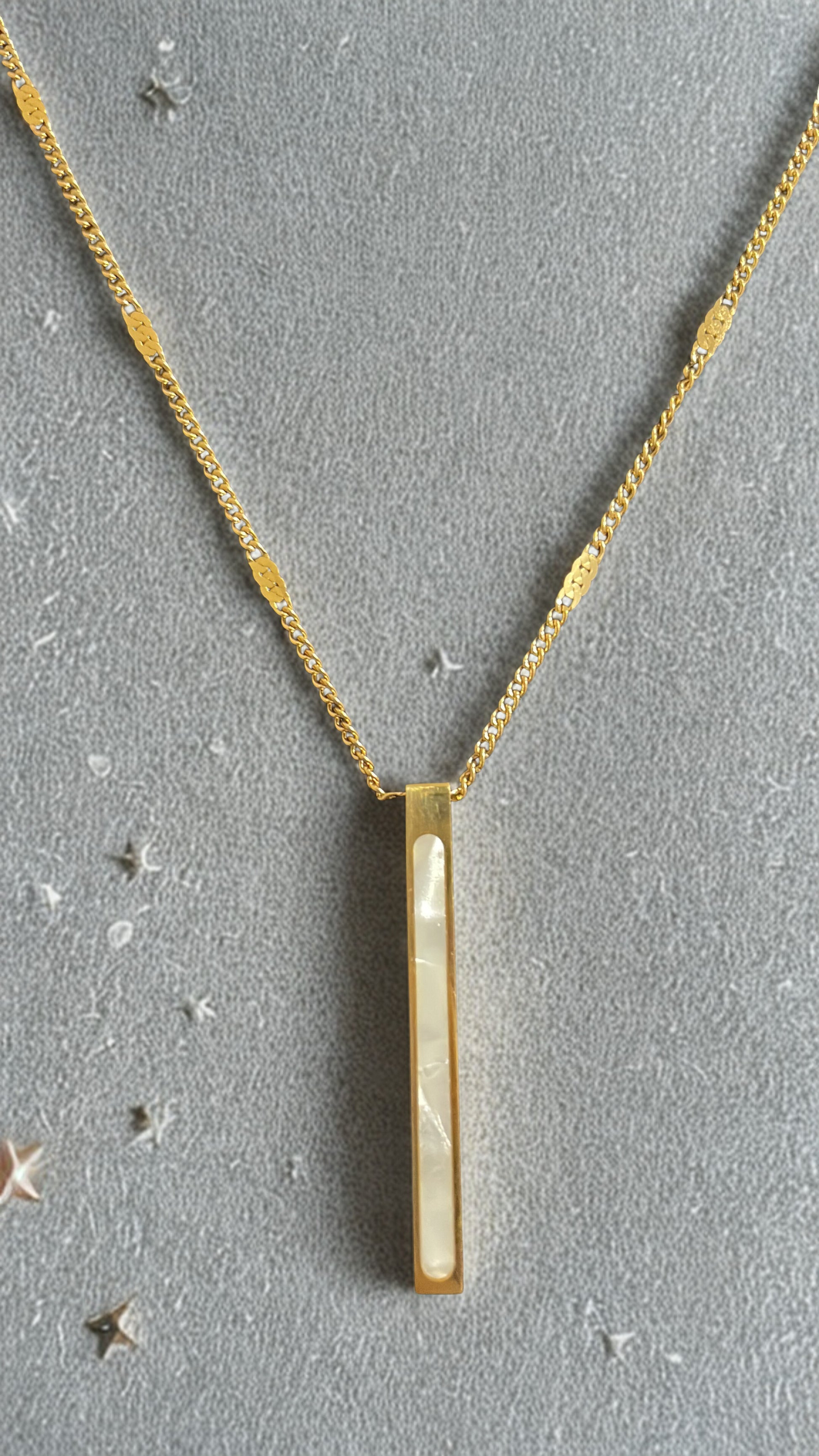 Add a touch of timeless elegance to your look with this stunning gold pendant necklace. Featuring a sleek rectangular bar with a beautiful mother-of-pearl inlay, this piece combines minimalist design with a hint of luxury.