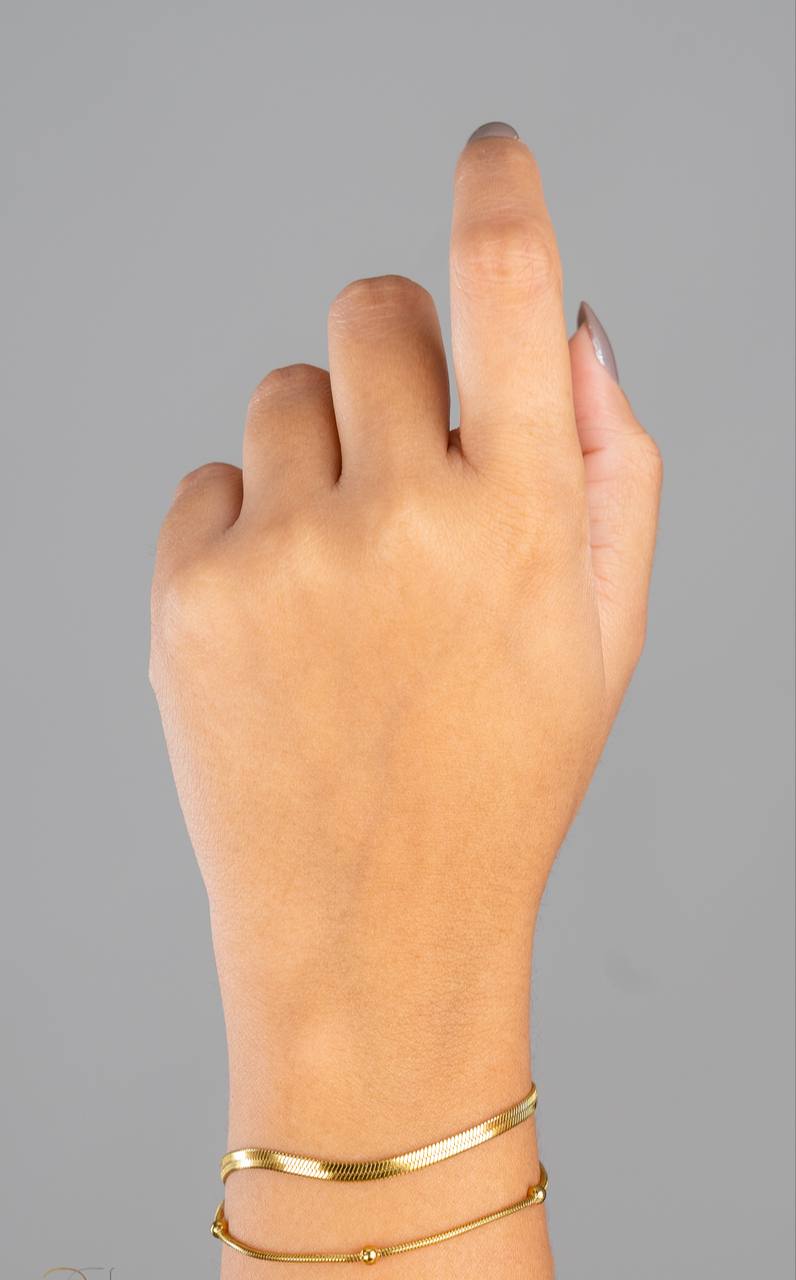 Elevate your style with our Elegant Gold-Tone Double Chain Bracelet. Featuring two delicately intertwined chains, one in a sleek herringbone pattern and the other adorned with petite golden beads, this bracelet exudes sophistication and charm. The perfect accessory for any occasion, its timeless design seamlessly complements both casual and formal outfits.
