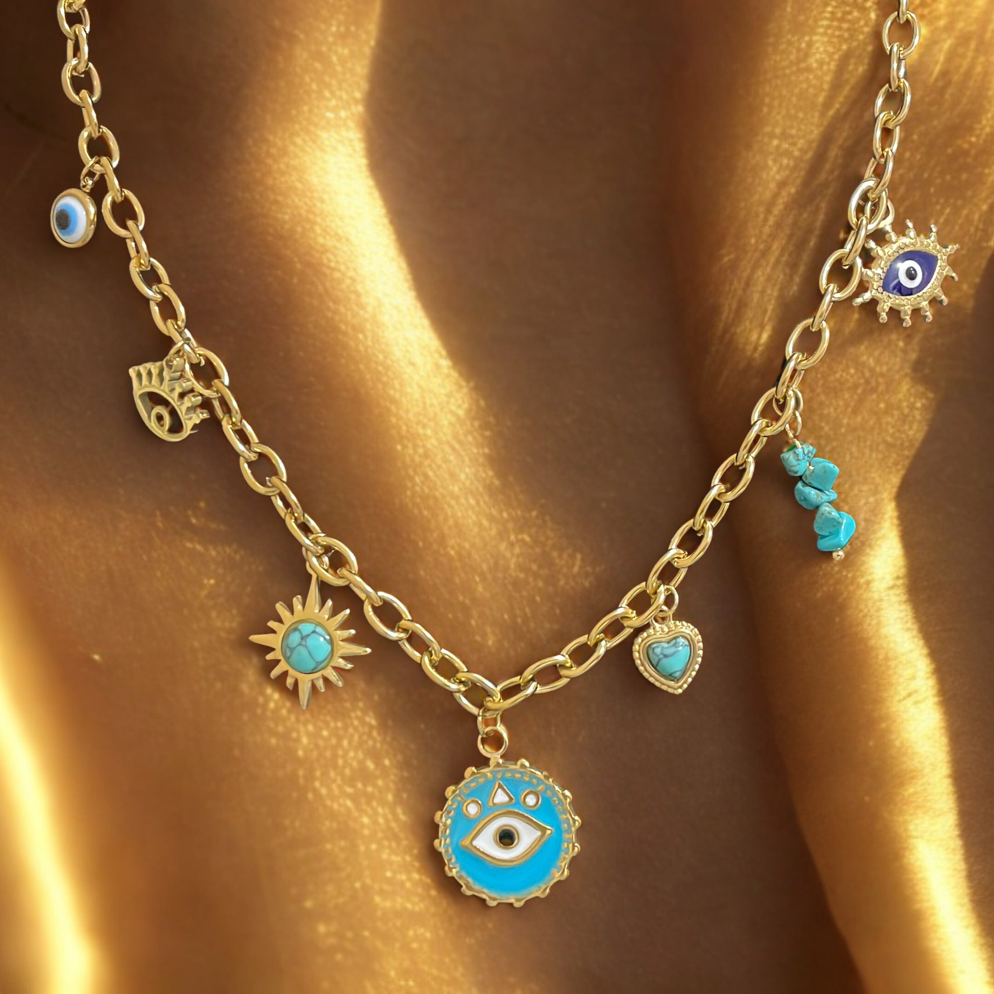 A playful yet powerful piece. This gold-toned chain carries charms of protection and love: the iconic Evil Eye, the radiant Sun, and delicate turquoise hearts. Designed to keep the bad vibes away while adding a pop of color and elegance to your everyday look.