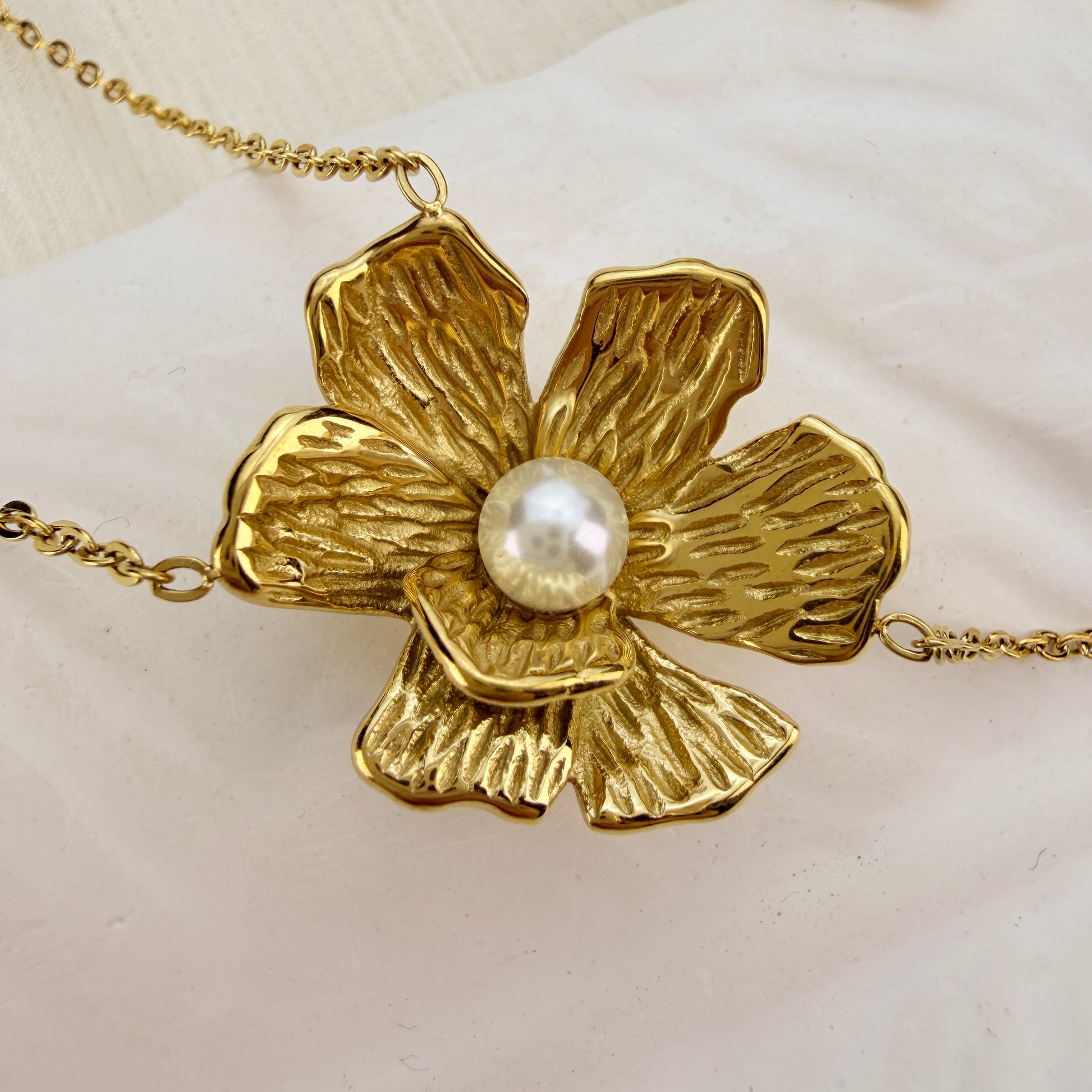 This stunning set features hand-crafted gold floral petals paired with luminous pearl centers, creating a soft yet striking statement. The necklace and earrings work beautifully together for special occasions, evening outings, or adding a sophisticated sparkle to your everyday style.
