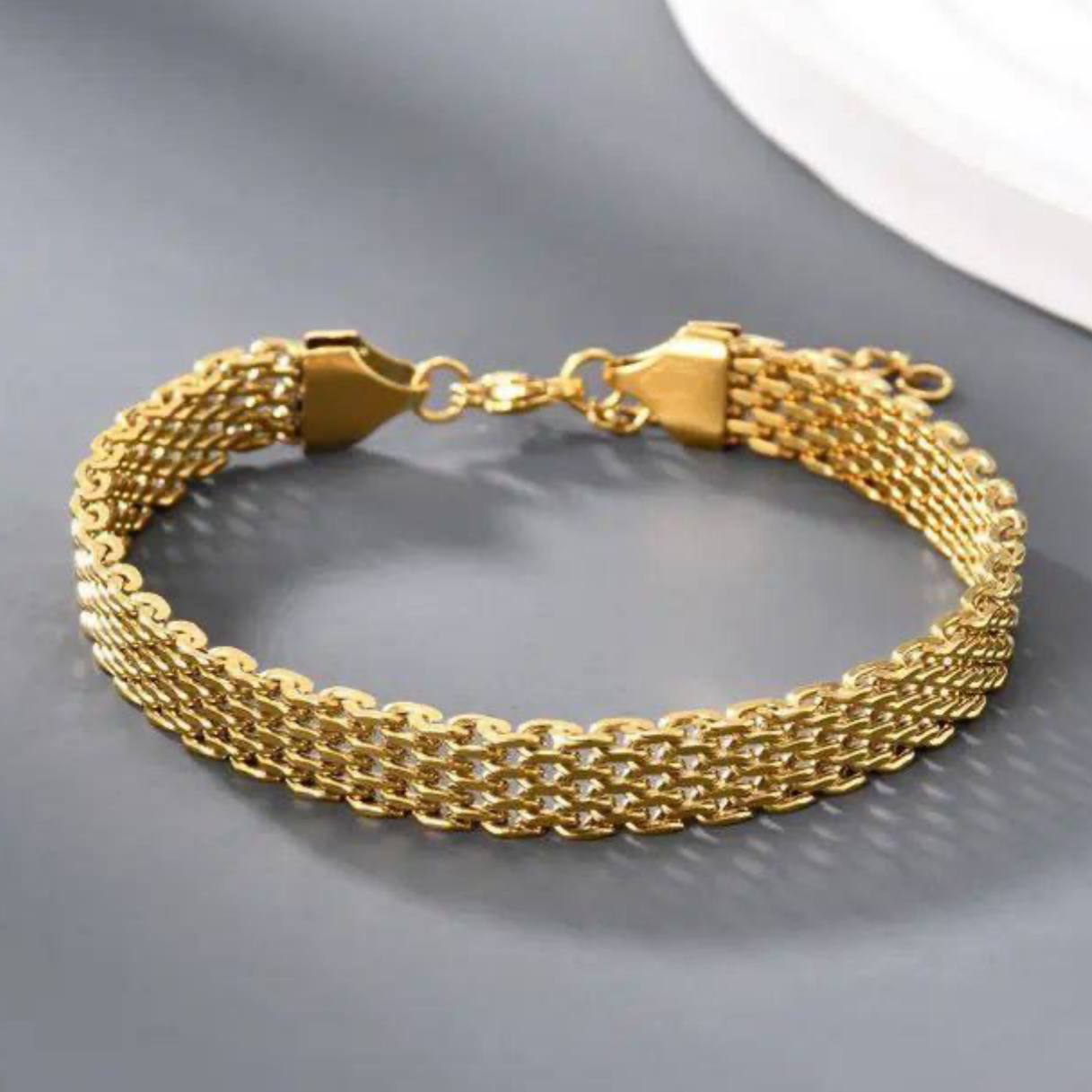 The Golden Grid Bracelet is crafted with a unique woven-link design that reflects light from every angle, giving you that high-shine statement look. Its wide band design makes it versatile enough to wear solo as a centerpiece or layered for a bold stacked style.