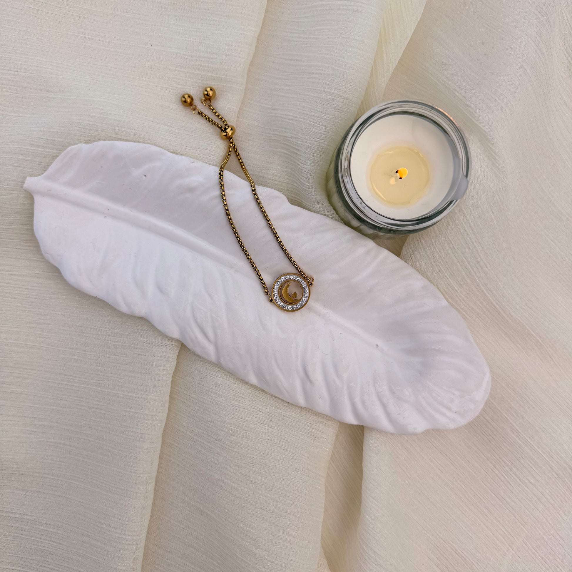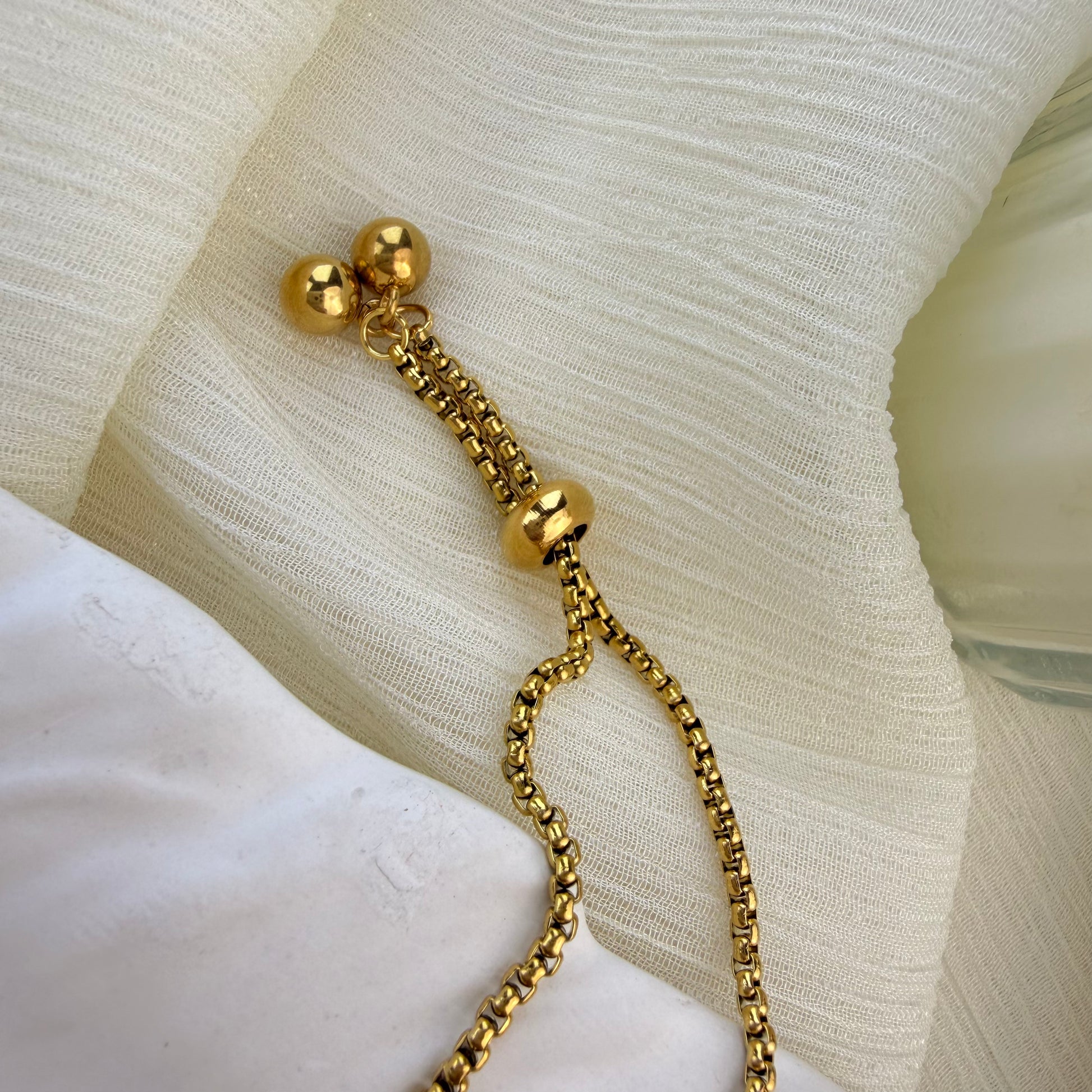 Crafted in a radiant gold-tone stainless steel, this adjustable bracelet features a round pendant with a cut-out globe design, framed by sparkling stones that shine like endless horizons. Its sliding clasp ensures a perfect fit for every wrist, making it both meaningful and stylish.
